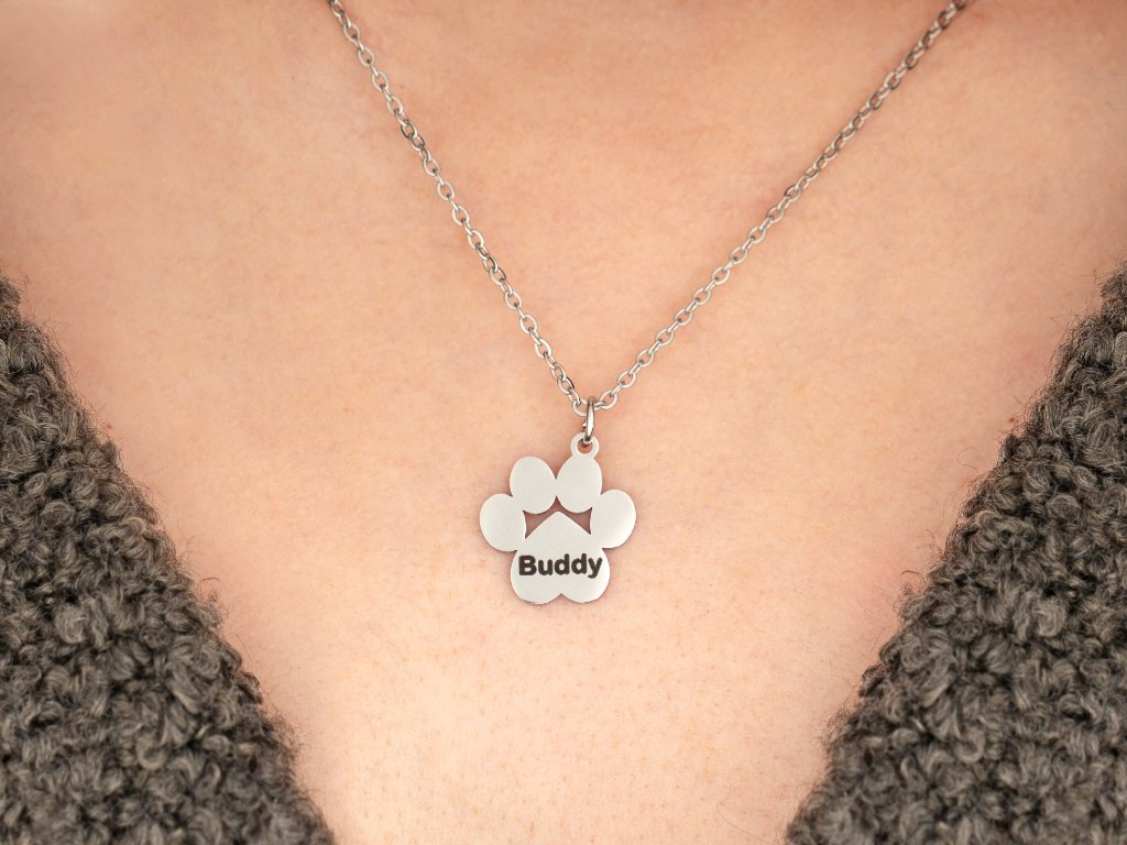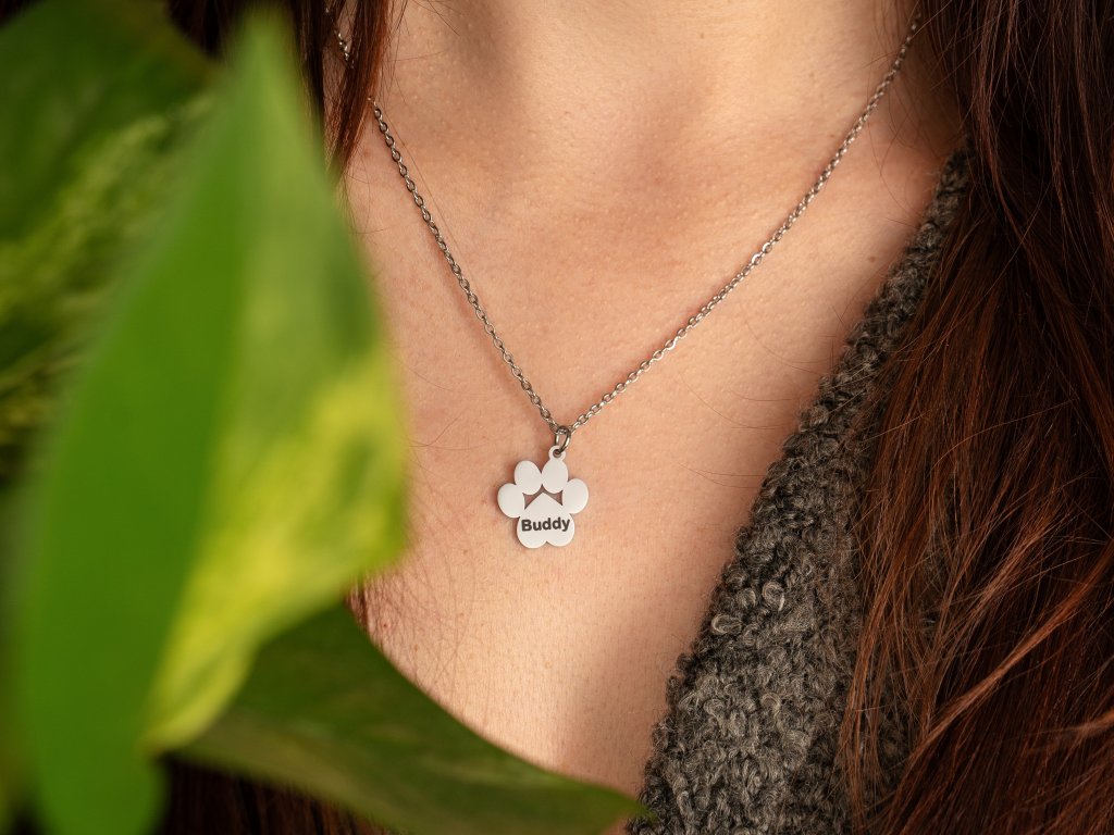 Tento elegantní náhrdelník s tlapkou a jménem pejska vykouzlí úsměv každému, kdo si chce uchovat vzpomínku na společné zážitky, radost z každého přivítání i bezpodmínečnou lásku, která se skrývá v tichém porozumění mezi člověkem a psem.