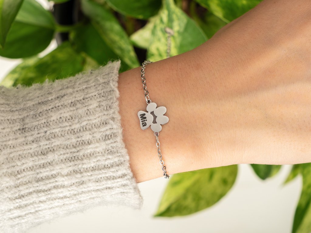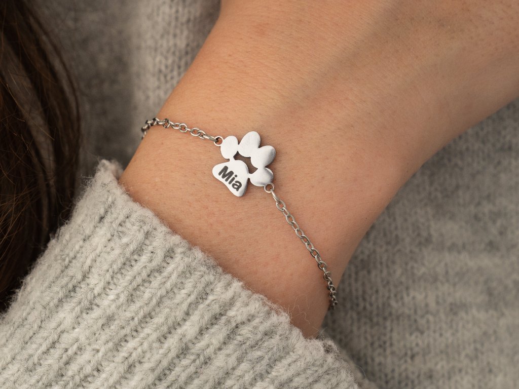 Tento elegantní náramek s tlapkou a jménem pejska vykouzlí úsměv každému, kdo si chce uchovat vzpomínku na společné zážitky, radost z každého přivítání i bezpodmínečnou lásku, která se skrývá v tichém porozumění mezi člověkem a psem.