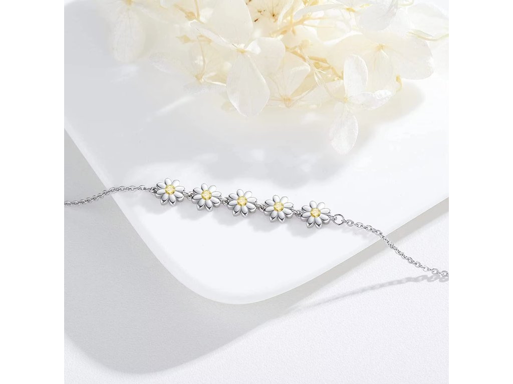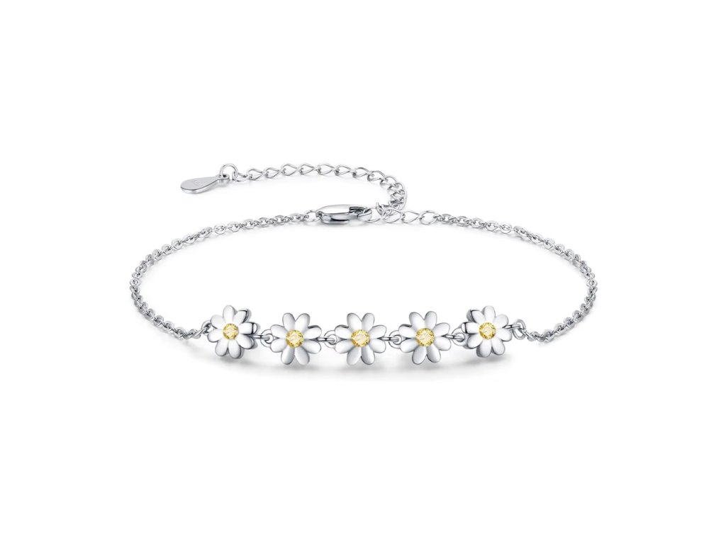 Elegantní stříbrný náramek s motivem sedmikrásky přináší kousek rozkvetlé louky přímo na vaše zápěstí. Bílé květy se zářivým žlutým středem působí něžně, svěže a přirozeně.
